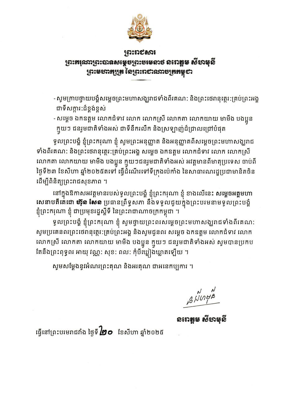 នៅព្រឹកថ្ងៃទី២៣ ខែសីហា ឆ្នាំ២០២៥ស្អែកនេះ ព្រះករុណា ព្រះបាទ សម្តេចព្រះបរមនាថ នរោត្តម សីហមុនី ព្រះមហាក្សត្រ នៃព្រះរាជាណាចក្រ និងសម្តេចព្រះមហាក្សត្រិយ នរោត្តម មុនិនាថ សីហនុ សម្តេចព្រះវរៈរាជ មាតាជាតិខ្មែរ នឹងយាងទៅពិនិត្យព្រះរាជសុខភាពនៅរដ្ឋធានីប៉េកាំង ប្រទេសចិន នេះបើយោងតាមបណ្តាញ ព័ត៌មាន Fresh News ដែលបានចេញផ្សាយនៅក្នុងថ្ងៃនេះ ។នៅក្នុងព្រះរាជសារជូនប្រជារាស្ត្រខ្មែរ ព្រះករុណាជាអម្ចាស់ជីវិតលើត្បូង មានព្រះបន្ទូលថា ក្នុងឱកាស នៃការ គង់ប្រថាប់ពិនិត្យព្រះរាជសុខភាពនៅប្រទេសចិន, សម្តេចតេជោ ហ៊ុន សែន ប្រធានព្រឹទ្ធសភាកម្ពុជា នឹង ទទួលជួយកិច្ចការទាំងឡាយក្នុងព្រះបរមនាមព្រះអង្គ ។គួរបញ្ជាក់ថា រដ្ឋាភិបាលចិន បានយកចិត្តទុកដាក់ខ្ពស់បំផុតលើព្រះរាជសុខភាពរបស់ព្រះមហាក្សត្រខ្មែរ និងសម្តេចវររាជមាតាជាតិខ្មែរ ហើយបានថ្វាយក្រុមគ្រូពេទ្យពិនិត្យព្រះរាជសុខភាពព្រះអង្គទាំងទ្វេជាទៀងទាត់ ដោយមួយឆ្នាំពិនិត្យព្រះរាជសុខភាពថ្វាយព្រះអង្គទាំងទ្វេចំនួនពីរលើក។ លើកទី១ធ្វើឡើងនៅដើមឆ្នាំ ហើយ លើកទី២ ធ្វើឡើងនៅចុងឆ្នាំ ៕